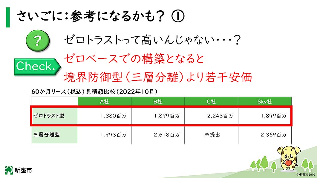 ゼロトラスト・フルクラウドは、従来の三層分離型やオンプレミス型より高くなるのでは、といった疑問があるかもしれません。当市ではゼロベースからの検討という前提でしたが、比較見積もりを提出した3社とも、ゼロトラスト・フルクラウド型の方が安価でした。中長期的に見ても、機器更改などを考えると大きな差は生じないと考えています。