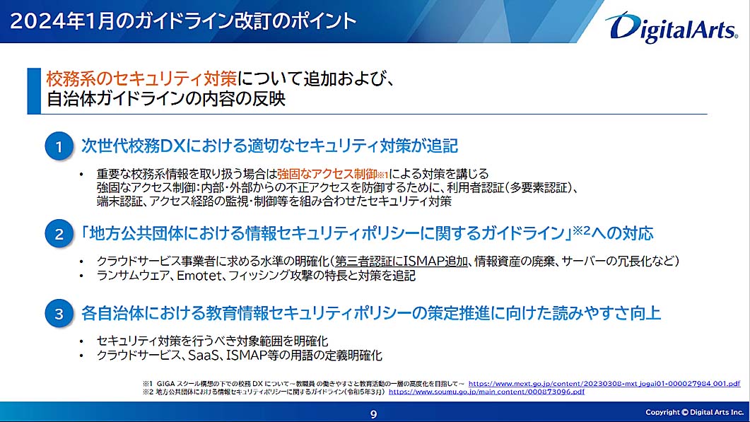 まず、「教育情報セキュリティポリシーに関するガイドライン」について。このガイドラインはアップデートが繰り返されていますが、最新版ではどういったことが求められているのでしょうか。