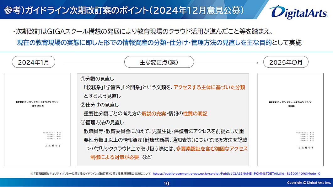 今回の改訂は、教育現場のクラウド活用が進んでいることなどを踏まえ、情報資産の分類・仕分け・管理方法の見直しや、セキュリティ対策に関する記載の見直しを主な目的として実施予定です。