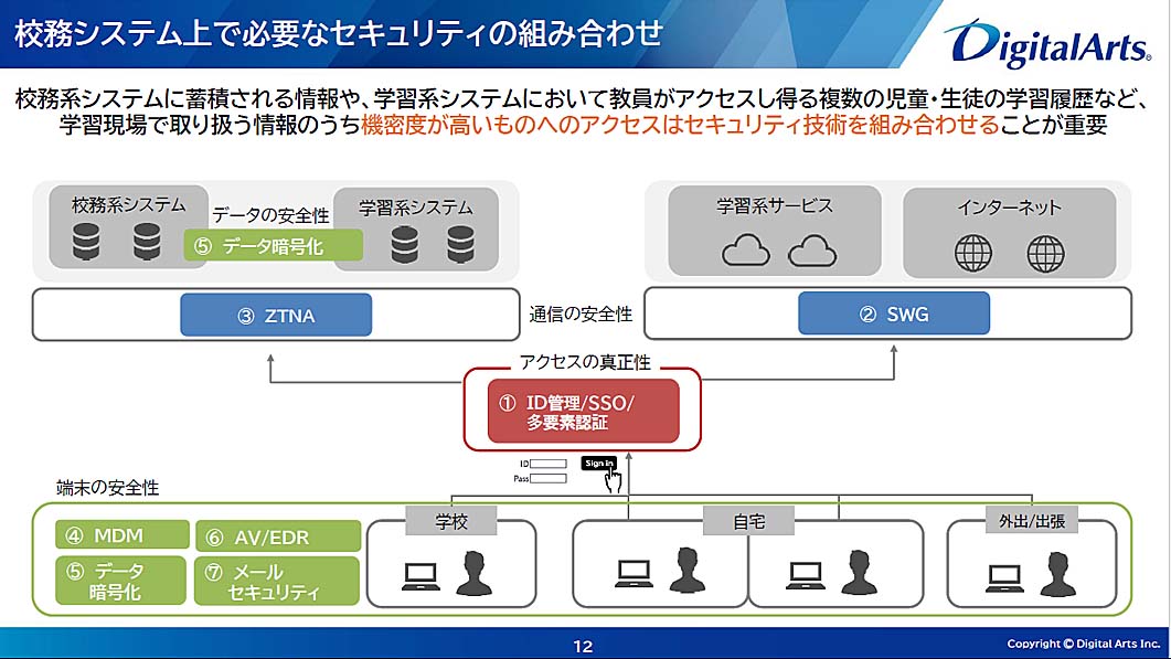 「アクセスの真正性」については、多要素認証で対応。ID管理やシングルサインオンなどが要素技術に該当し、「通信の安全性」はSWG(セキュアウェブゲートウェイ)を学習系サービスやインターネットにアクセスする際の門番として置く。さらにZTNA(ゼロトラストネットワークアクセス)で、内部システムにアクセスする際は従来のVPNを代替し脆弱性をカバーする、というイメージです。