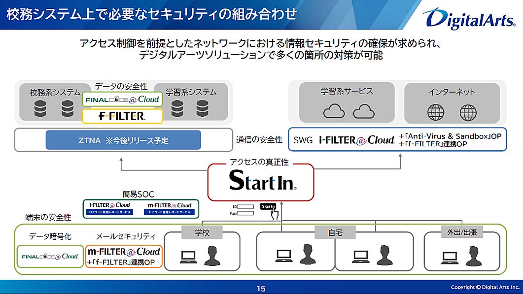 通信の安全性については、安全なウェブアクセスを実現する「 i-FILTER」の クラウド版がその役割を果たし、組織内のアクセスについてもZTNA製品が今後リリース予定。こうしたデータへのアクセス時に、アクセスの真正性をチェックする認証ソリューション「StartIn」が活躍します。