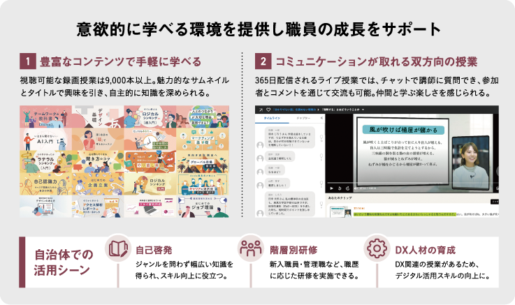 行政課題の多様化や社会変化に対応するには、多角的な思考力と判断力の強化が欠かせない。そこで、業務スキルの向上だけでなく、ライフスタイル関連の内容も学べるオンライン学習サービス「スクーフォービジネス(Schoo for Business)」に着目。講師と受講者が双方向でやりとりできるライブ授業や、日々更新される最新の録画授業が、学習習慣の定着に効果的だと判断したという。