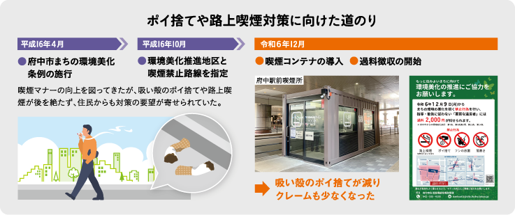受動喫煙を防止するための施策を推進する自治体が増えている。同市も平成16年に「府中市まちの環境美化条例」を施行し、府中駅など市内5駅の周辺を喫煙禁止路線と定め、指導に力を入れてきた。しかし、条例違反者が後を絶たず、住民からの苦情も多かったという。