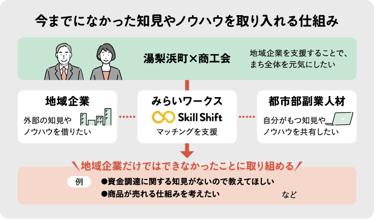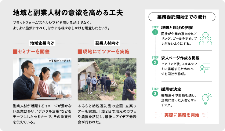 令和5年度から始まった事業で活用したのは、同社が運営する「スキルシフト」だ。同サービスは、地域企業と都市部の副業人材をつなぐプラットフォーム。マッチング後、企業は月に約5万円を支払うことで、専門的なスキルをもつ人材の力を活用できる。