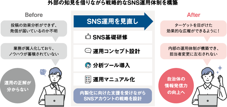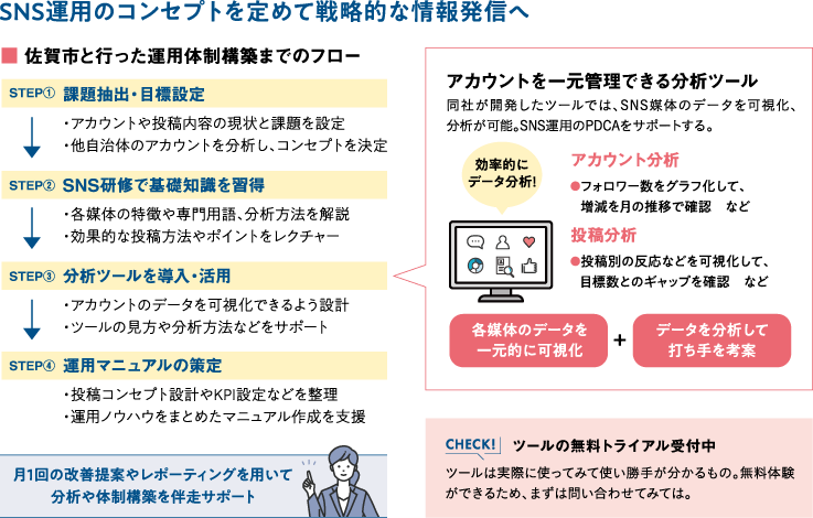 そこで、SNSの効率的な運用と職員のリテラシー向上には、外部の知見が必要だと判断。令和6年に実施した「SNS情報発信力強化支援業務」のプロポーザルで、SNSマーケティングを手がける企業「トゥー」を採用した。同業務では、SNS運用の戦略設計からデータ分析ツールの提供、運用マニュアルの策定までを、同社が一気通貫でサポート。約半年間で、SNS研修やアカウントのコンセプト設計などを伴走しながら、運用体制を構築して、情報発信力の強化を目指すものだ。