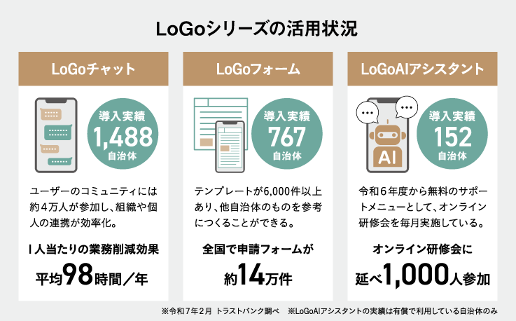 LoGoAIアシスタントは、LoGoチャットから利用でき、生成AIを使えるサービス。令和7年2月時点で152自治体が導入しており、文章作成や議事録の要約、マクロ作成などに使われている。「日常的に使っているチャットで利用できるため、生成AIに対するハードルが低くなると好評です」。令和5年に同社が実施した調査では、6割以上の職員が“1日10分以上の業務改善効果がある”と回答。使い方を伝えつつ成功事例を共有する場として、オンライン研修会も毎月実施しており、参加者は累計で1,000人を超えたという。