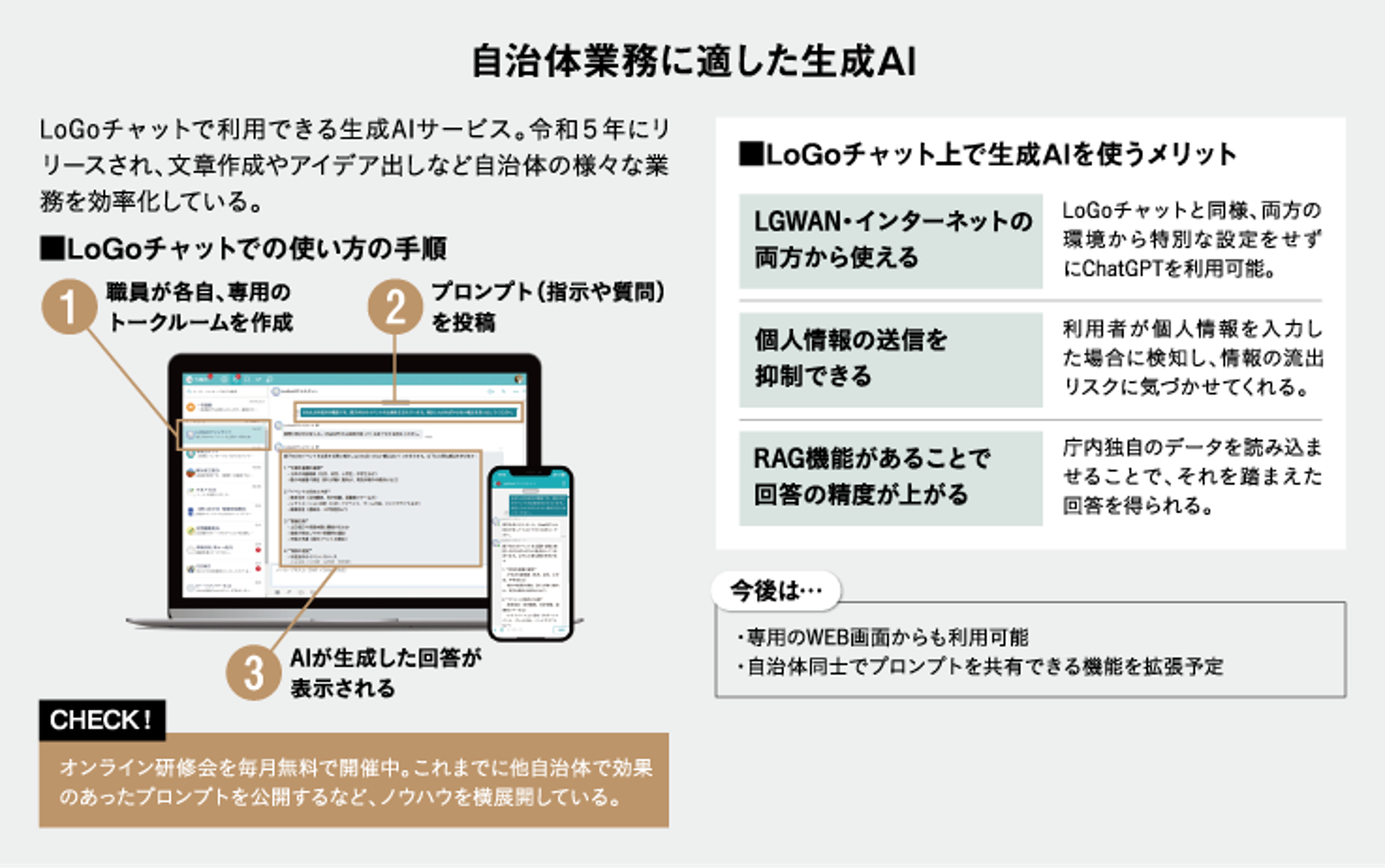 今後は他自治体と情報交換しながら、成功事例を取り入れ、さらにRAGの活用も進めていくことが目標だという同市。新たなツールを庁内に浸透させるためのヒントになりそうだ。