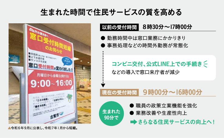 なお、受付時間の短縮を開始した令和7年1月から3月までの時間外勤務は、前年の同期間と比較して1,432時間、割合にして14.4%も削減されたという。この大きな成果は、同市が積み重ねてきた取り組みの集大成といえるだろう。