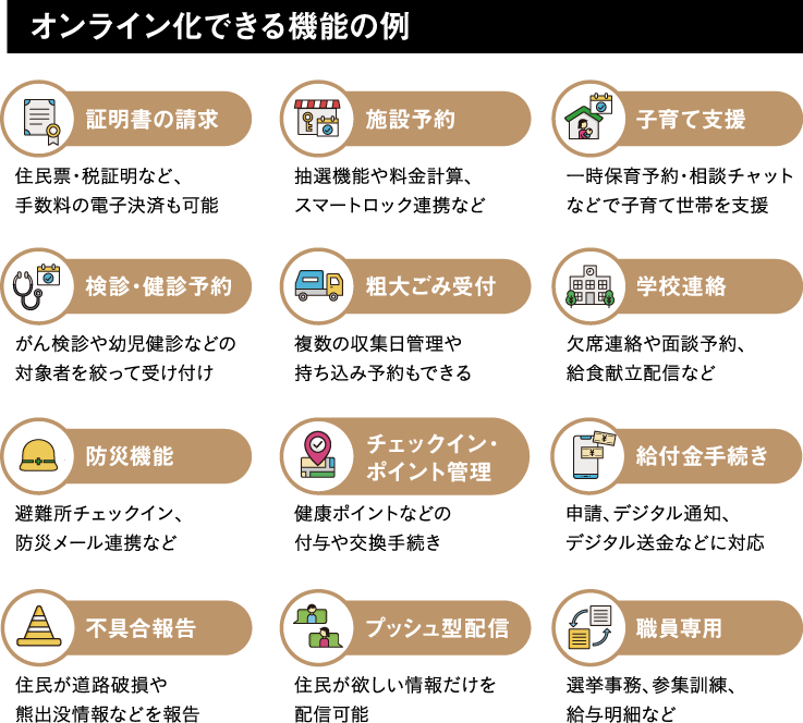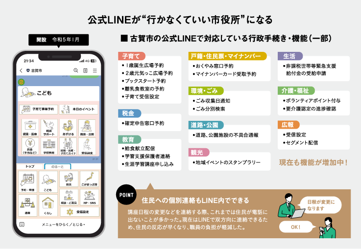 行政特化型で、自治体業務にマッチした機能が数多くある同サービス。幅広い年齢層が普段使いしているLINEだから、住民の利用率も高いという。ここではその全体像を紹介しつつ、古賀市の担当者に、実際に行った工夫などを解説してもらった。