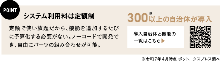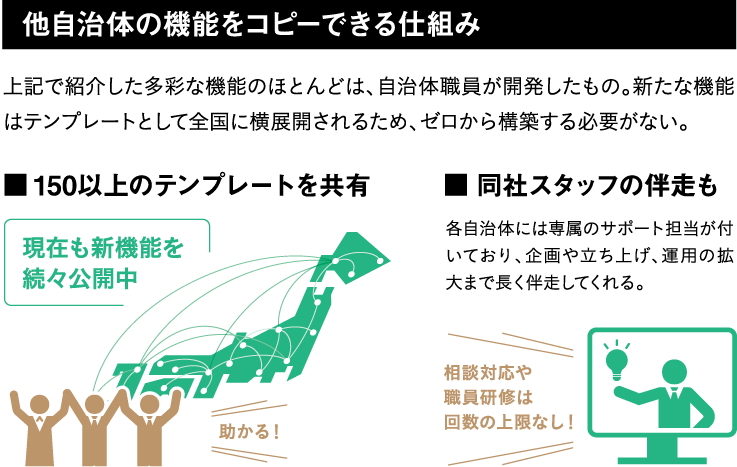 当市では、機能の構築はデジタル推進課で、全体調整などは当課でと役割を分担。他自治体で機能が増えると、構築担当が庁内に“こんなのどう?”と発信しています。興味をもった職員がいれば、テンプレートを使って、要望を聞きながらその場で古賀市バージョンに。完成までのタイムラグがほぼないので、DXの機運も高まっています。