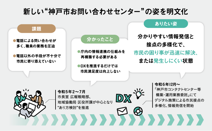「トランスコスモス」は自治体のありたい姿を描く段階から伴走し、その自治体にとって最適な提案を実施。神戸市の“あり方検討支援業務”では、職員と一緒に複数の課題を洗い出し、電話依存からの脱却など施策立案を支援した。