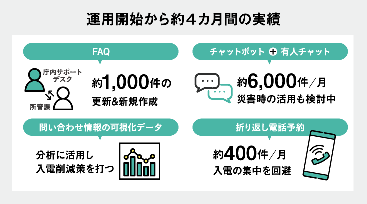 入電数や問い合わせ内容は、システムでリアルタイムに把握できる状態になっている。庁内サポートデスクでは、これらのデータも活用しながら所管課への改善提案を行っているという。「例えば、問い合わせが多かった内容について所管課と連絡を取り、“ホームページのこの部分に補足を入れましょう”“こうすれば市民の困り事が解決すると思います”といった形で、改善に向けたやりとりを行っています。特にFAQについては、頻繁に提案をもらっており、運用開始から約4カ月で、1,000件ほど更新や新規作成が行われています」。