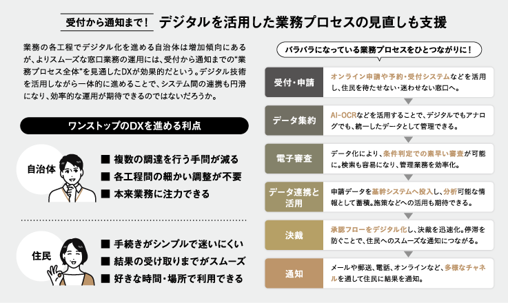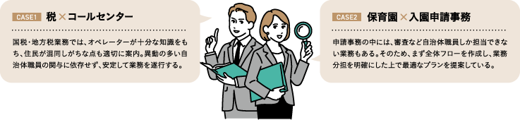 窓口業務や税務、給付金関連など、様々な分野で自治体のコールセンター業務や事務業務を受託。自治体業務に長年携わってきた経験から、業務フローを用いて具体的な提案が可能だという。
