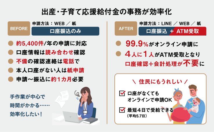 ATMを活用した給付方法を採用し、市公式LINEからの申請も可能に。