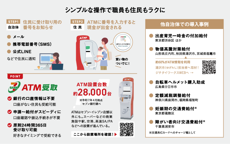 そこで同市は、より簡単な給付方法を模索。クーポンなども検討する中で注目したのが「ATM受取」だった。同サービスは、セブン銀行ATMに番号を入力するだけで現金を受け取れる仕組み。自治体・住民ともに同行の口座開設は不要で、原則として24時間365日受け取りができるという。