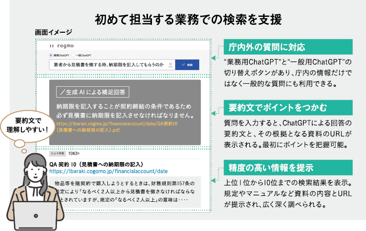 同サービスでは、庁内システムの各所に散在するドキュメントから必要な情報を集約して活用できる。さらに根拠資料検索機能と回答文生成機能が付いているため、職員の質問に対して、法令、国からの通知、業務マニュアルなどから関係する箇所を探し、分かりやすく回答してくれるという。検索結果の画面には、回答の要約文と参照した資料のURLが表示される。「職員は何をするにも根拠が必要なので、すぐに資料を確かめられるのは便利ですね。URLから直接、資料の該当ページへ飛べるため、調べる時間が大幅に減少しました」と稲垣さん。