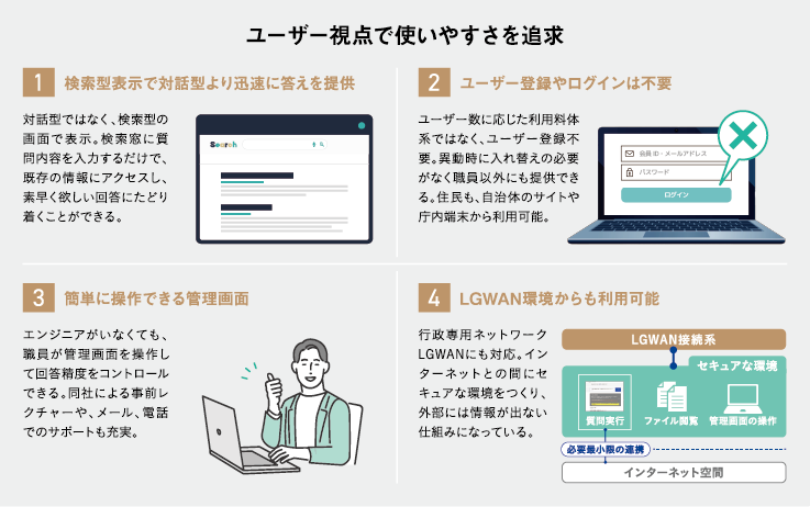 自治体職員は常に行政のプロとして見られ、未経験の業務に着任したばかりでも住民や事業者に対応する。「私も初任時には資料探しに時間を費やし、上司と2人がかりで調べたこともありました。生成AIによって職員をサポートできれば、本来注力すべき住民サービスや、施策立案などにもっとエネルギーを割けると期待しています」と和賀さん。知りたい情報を迅速に入手でき、参考となる回答を提示してくれる生成AI。うまく活用すれば業務効率が上がり、より質の高いサービスの提供につながっていくのではないだろうか。