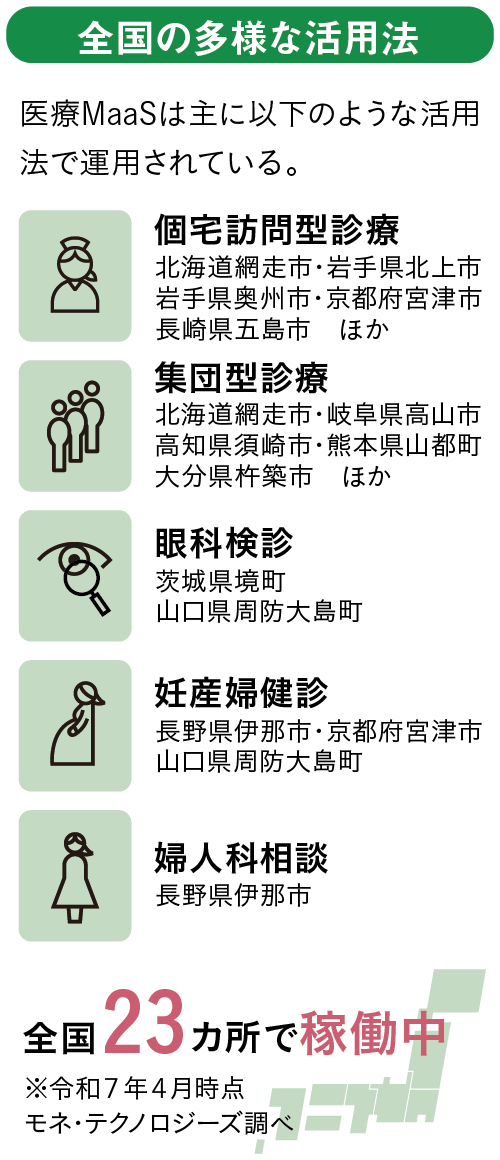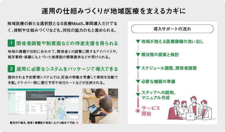 車両の運行については、同社が地域交通事業者と協議を進め、運転士を確保。同年の11月に住民向けの体験会を開き、12月からレンタル車両による実証事業を始めた。「住民からは“対面の診察と比べて遜色ない”“受診しやすい方法を考えてくれるだけでもありがたい”といった声が寄せられました」。