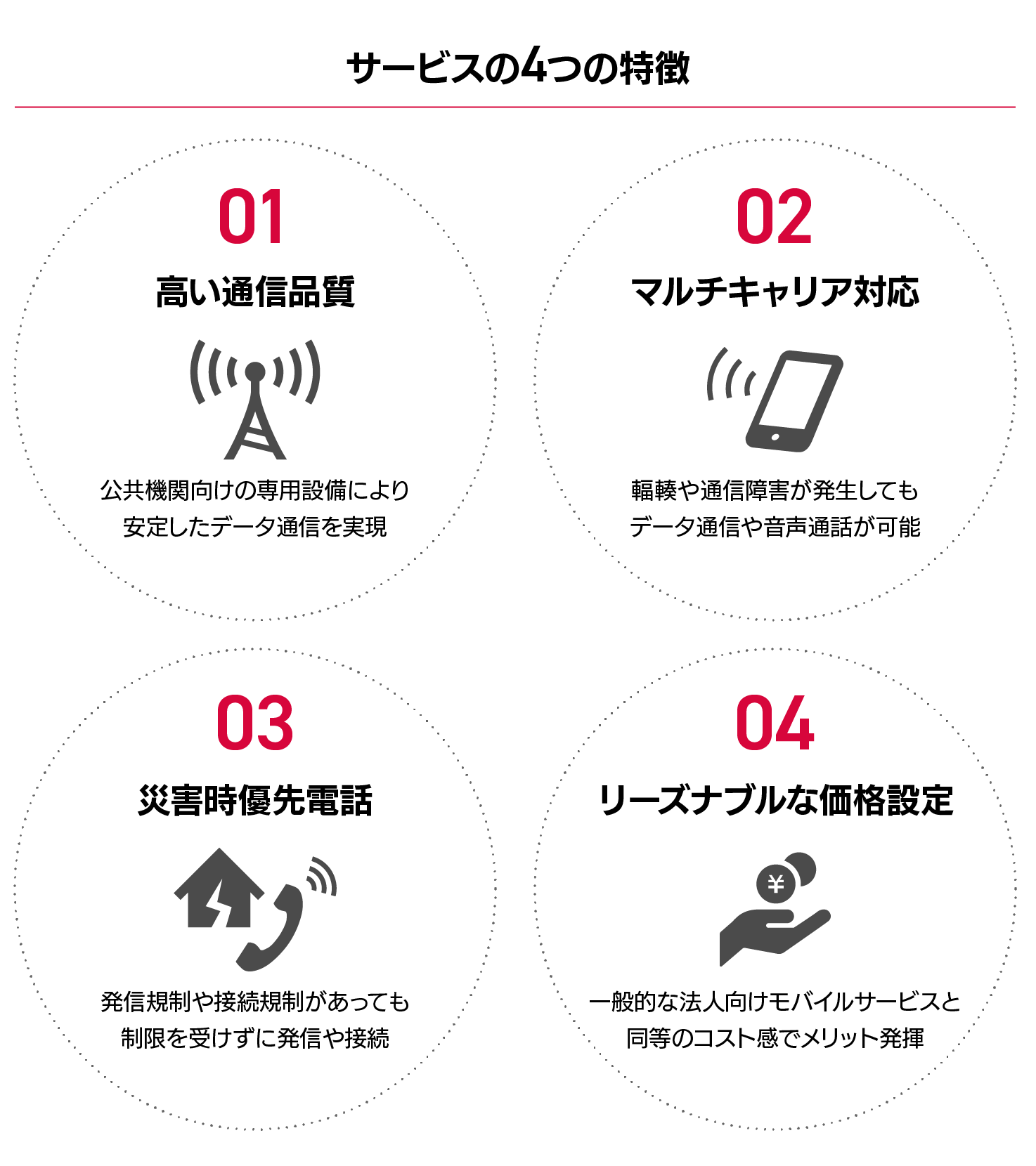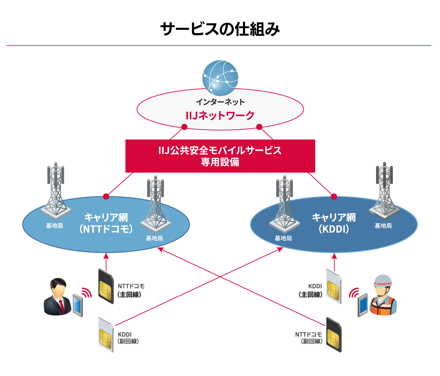 これらの機能を併せ持っているため、平時では公用携帯電話、有事の際には災害時非常通信機としてIP無線機のように活用できる。また、こうしたサービスを導入する際にはコストがネックになる場合が多いが、同サービスでは、マルチキャリアにおける設備の共用化を可能な限り進め、各キャリア独自の部分をそこに乗せるという手法をとっているため、個別に2社と契約するよりもコストを低減できるのだという。