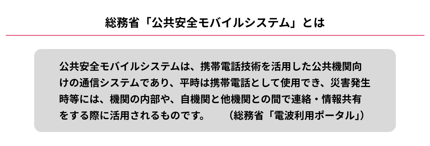 こうした現実や、大規模災害で発生した通信に関する課題を踏まえ、総務省は「公共安全モバイルシステム」に関する取り組みを推進している。