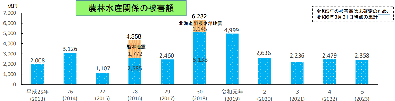 また、地震や津波でも農地ががれきに埋まる、冠水するといった被害が発生している。