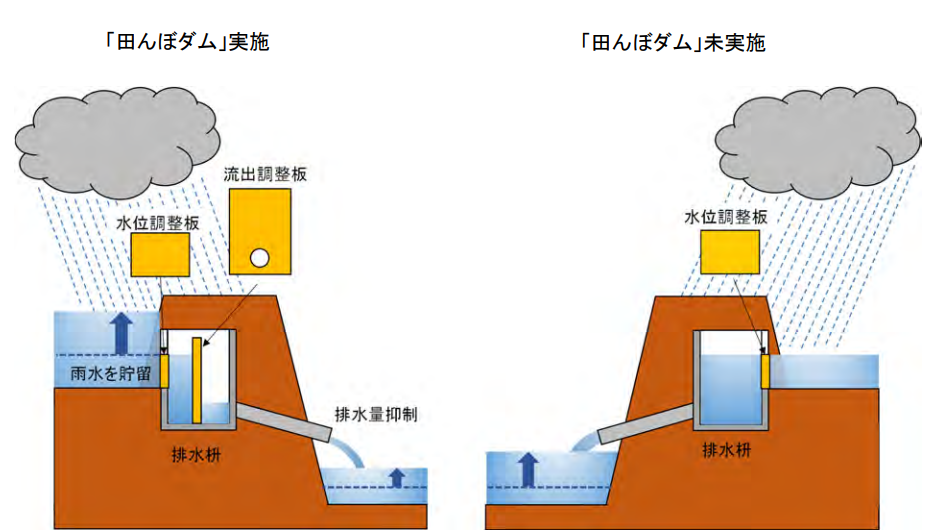 田んぼダムとは、水田の排水口に小さい穴を開けた調整板や堰板(せきいた)を取りつけ、貯まった雨水を徐々に排出できるようにしたものである。水路や河川の急激な水位上昇を防止し、あふれる水量や範囲の抑制も可能になる。ダムや遊水地のような施設ではなく取り組みであり、実施する地域だけでなく、下流域の排水路・河川にも効果があるのが特徴だ。