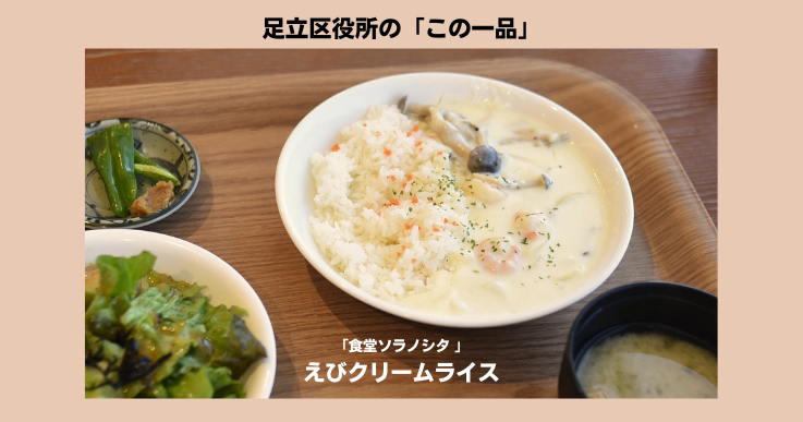 東京都足立区役所には2つの食堂があります。このうち南館14階にある展望レストランが「食堂ソラノシタ」。区が進める「おいしい給食」から生まれた人気メニュー「えびクリームライス」が食べられるのが話題です。