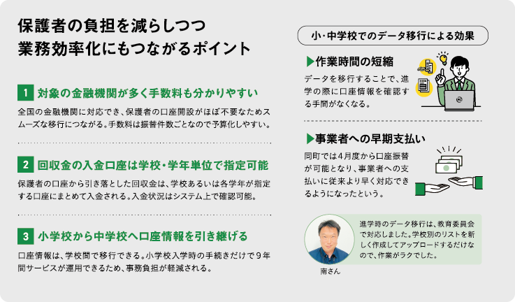 同町には1つの中学校と4つの小学校がある。その中で児童数が一番多い小学校と中学校で、同年11月からの運用を目指した。保護者に夏休み明けに連絡し、口座振替依頼書を配布。トラブルなく運用を開始できたという。「保護者からは“現金を用意する手間がなくなりラクになった”との声が寄せられ評判も上々。学校現場では、作業時間がかなり削減された上、指定日に入金されるので喜ばれているようです」。その後、年度替わりのデータ移行も、問題なくクリアできたという。