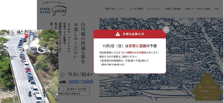 サイトにアクセスすると、“大切なお知らせ”として混雑期間のアラートが表示される。サイト閲覧者は必ずこのアラートを目にする仕組みだ。また、混雑状況が一目で分かるように、ライブカメラの映像を配信。交通規制状況を知らせて注意を促すとともに、混雑回避のお役立ち情報も提供する。「利用者にとって分かりやすく、なおかつ発信者サイドが届けたい情報を効果的に打ち出したいと考え、試行錯誤しました」と小瀬さん。ページの右下には“知っていますか 白川郷ルール”という表示を固定。マナー啓発サイトへの有効な動線としても機能しているそうだ。
