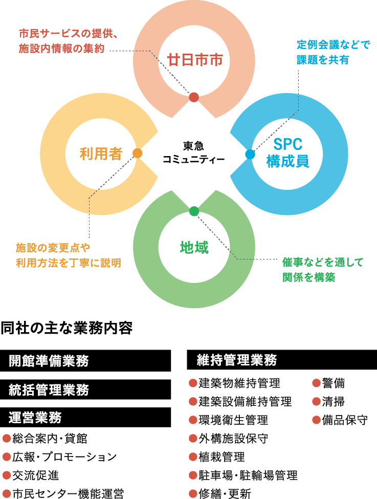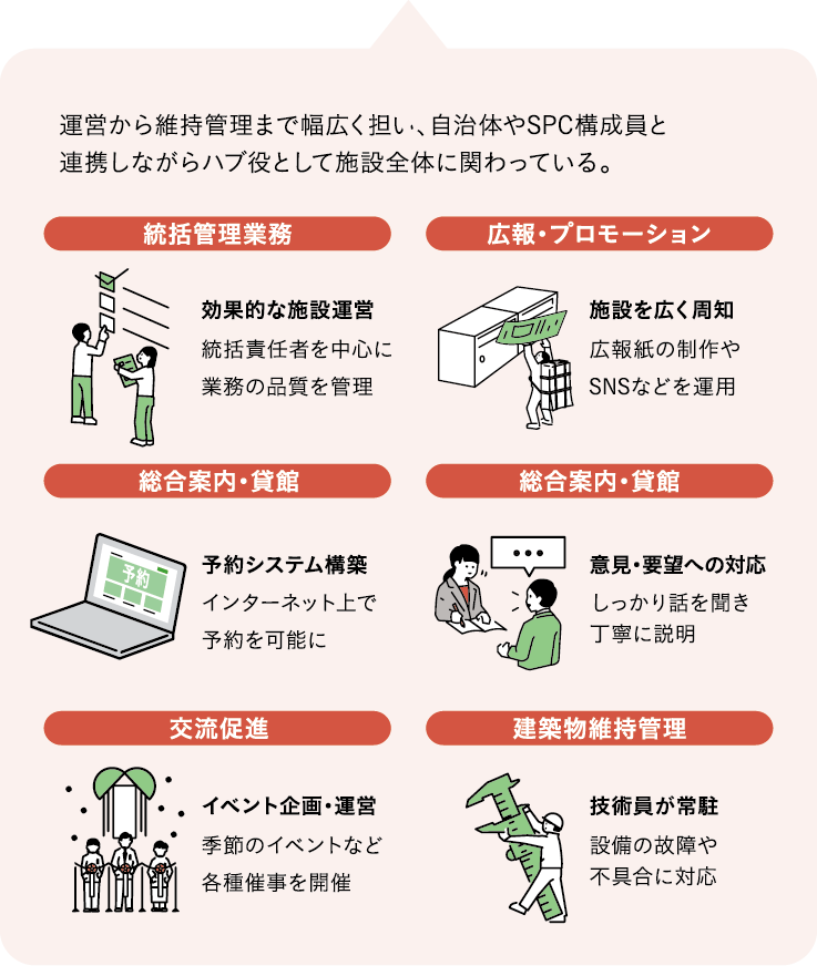 様々な関係者と連携して施設を円滑に運営するため、私たちは全体の調整役を担っています。各施設の所管課からの情報を集約し、部署を横断した運営や、SPCではハブ機能となり、複数構成企業であることを活かした共同イベントも積極的に実施してきました。関係者との密な連携はもちろん、利用者が心地よく過ごせる雰囲気づくりも重視。気軽に挨拶や世間話ができる和やかさが定着し、目的がなくてもフラッと立ち寄れる施設へと成長したと感じています。