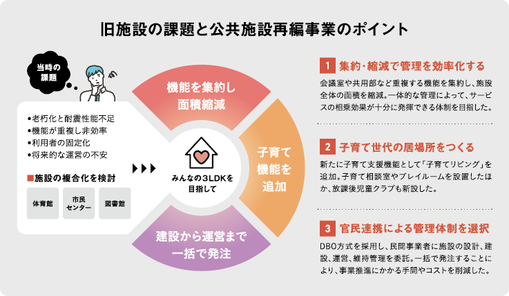 整備にあたっては、各施設の役割と機能を見直し、重複する部分を整理して施設の面積縮減を図ることで、将来的な管理の効率化を目指した。また、官民連携の可能性を探る調査を行い、手応えが得られたことから、民間事業者に設計・建設・運営などを一括発注するDBO※1方式を採用することに。