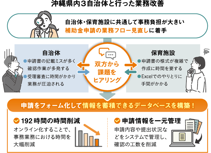 令和6年には、こども家庭庁より採択を受け、沖縄県那覇市(なはし)・南城市(なんじょうし)・西原町(にしはらちょう)とともに実証事業を行った。同社からの提案に対し、保育現場に課題を抱えていた3自治体が賛同して、共同でのBPR事業が始まったそうだ。