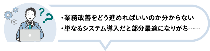 単なるツール導入の支援ではなく、業務の全体を見渡した上で、効率化できる業務フローを再設計。部分最適にとどまらず、全体の最適化を見据えて提案を行う。