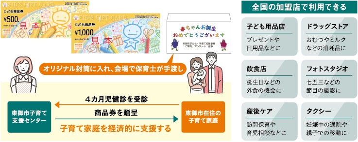 同年7月から同社と協議を始め、随意契約を経て、11月には事業を開始した。商品券は、4カ月児健診で、子育て支援センターの保育士が手渡しする。対面によるやりとりで、顔が見える関係を築き、同センターが行う支援事業への参加促進につなげていきたいという。「おむつ専用の券を独自に発行する案もありましたが、発行や換金などの新たな仕組みの構築に手間と費用がかかることが想定されました。こども商品券なら、すでに仕組みが整っており、事務作業も一任できるため、負担を抑えつつ、子育て家庭に還元することができると思いました」。予算は、当年4月から翌年3月までの出生見込みをもとに算定し、年度初めに一括購入。子ども1人当たり1,000円券50枚を1セットとして納品される。