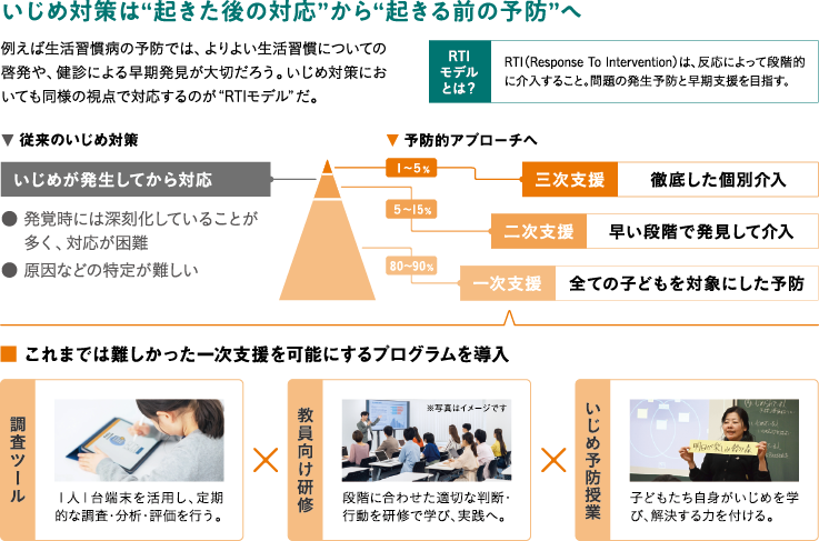学校・自治体が抱える課題に対し、調査を行うだけでなく、“適切な判断と行動”までを支援するプログラム。教育現場での実務経験をもつ研究スタッフが、エビデンスにもとづき設計したという。
