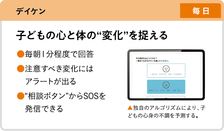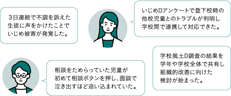 導入した調査ツールは、児童・生徒の心身の状態を把握する「デイケン」と「NiCoLi(ニコリ)」、いじめの実態や学校の風土を調べる「いじめDアンケート」と「学校風土D調査」の4種だ。いずれも1人1台端末で実施でき、子どもたちの日々の変化をデータで把握できる。「これまでは、子どもが声を上げるのを待つか、教員が様子を読み取るしかありませんでした。今は毎日データが得られるため、変化に気づきやすくなったようです」。実際、データをきっかけに声をかけ、早期予防につながった事例もあるという。