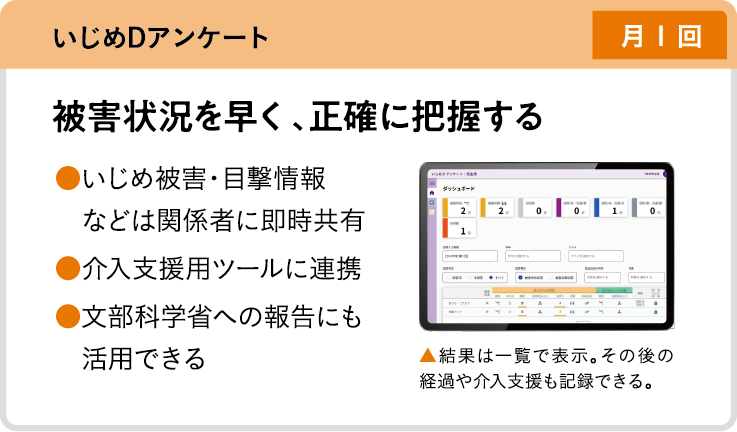 子どもたちの変化や、いじめの実態、学校風土の把握ができる調査ツール。いずれも1人1台端末を利用。
