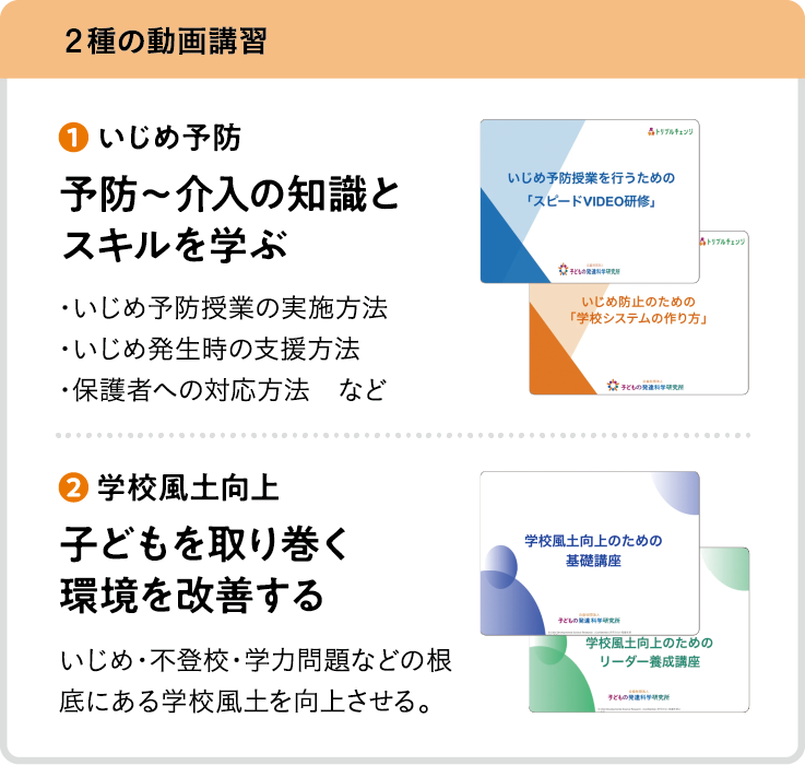 動画講習と対面研修を通じて、現場で活用できる知識や実効性の高い方法を学ぶ。受講後に学校側が自走できるよう設計されている。