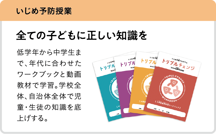 また、教員向け研修、いじめ予防授業にも、現場から評価の声が届いているそうだ。「教員の経験則に頼っていた部分を理論的に学ぶことで、自信をもって児童・生徒と向き合えるようになったようです。教員からは“もっと早く知りたかった”との声もありました。また、以前は各校がいじめに関する授業を独自に組み立て、教材も用意していましたが、今は統一されたワークブックや動画教材があり、授業の方法も研修で学べる。準備の負担や不安が減ったと思います」。
