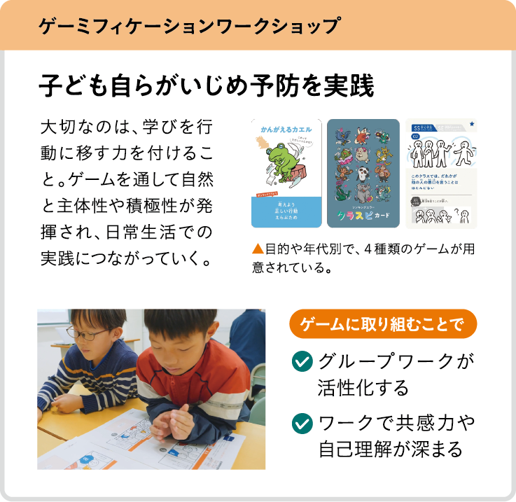 教員が研修でいじめ予防を学んだ後、実際に授業を実施。いじめが起きるメカニズムを知り、ワークショップで解決のスキルを身に付ける。