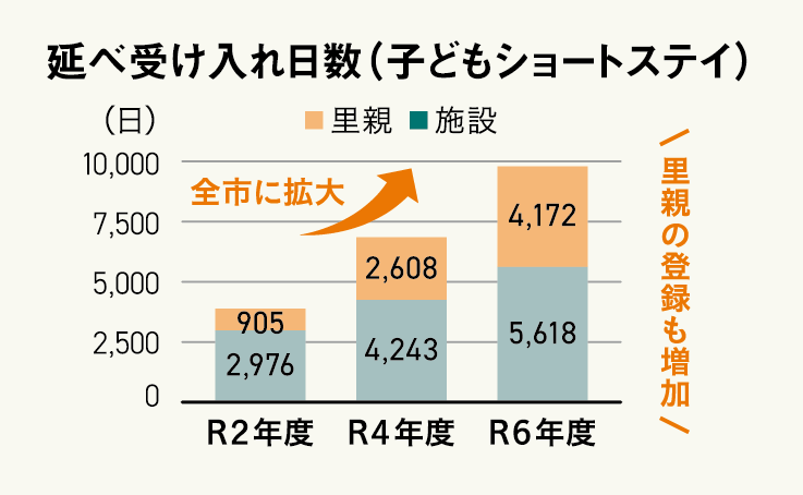 里親の募集はNPO法人が担い、チラシ配布や研修会・交流会などを実施している。養育里親の登録は直近5年間で約100世帯増加。令和6年度末時点で182世帯がショートステイ対応可能で、同年度延べ利用日数の約43%を占めている。「市民の中には、“短期間ならできそう” “社会に貢献したい”という人もみられ、受け皿が広がっています」。
