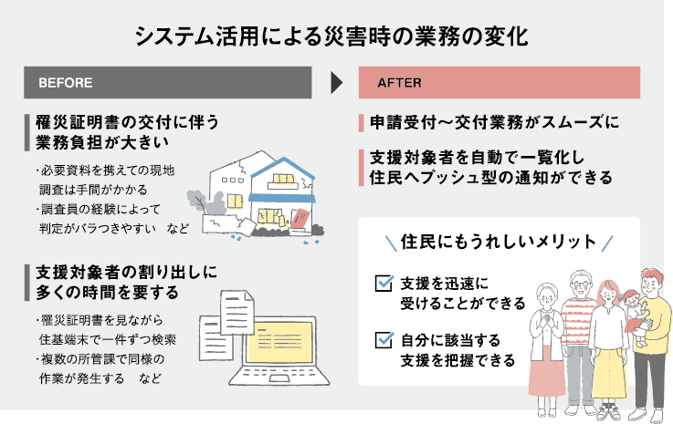 ただし、罹災証明書の交付は生活再建のスタート地点だ。被害認定調査の結果に応じて、災害見舞金や税の減免などの支援内容が決まる。被災者が一日でも早く元の生活を取り戻すには、迅速な支援の仕組みが重要だ。そこで、支援の実施までに時間を要している内部事務の現状に対しても、課題意識をもちはじめたのだという。「支援対象者を特定するために、罹災証明書をもとに住基端末で検索し、住所や氏名などを一件ずつ確認していました。さらに、支援の種類によって、所管課は介護保険や国保、税務など多岐にわたります。各課の担当職員がそれぞれ作業に時間を割いている状況で、どうにか効率化できないかと考えていました」と川村さん。