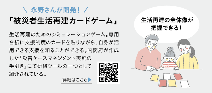 数多くの現場で被災者支援に取り組み、自治体職員と連携して活動してきた永野さん。自治体が抱える課題として挙げるのが、“生活再建の見通しを語れる人が少ないこと”だ。支援制度は複雑で、どのような支援メニューがあるのか分からない職員も少なくないという。