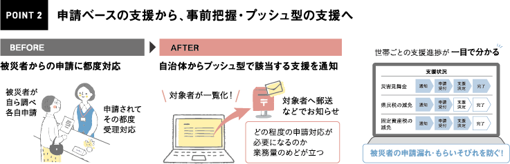 そこで共同研究を進める中で、システム上で情報を一元管理できるように工夫。罹災証明書の申請を受け付ける時点で住基データと連携させ、該当家屋と世帯情報をひも付けられるようにした。この仕組みにより、支援条件をあらかじめ登録しておけば、罹災証明書の交付と連動して対象者を自動抽出し、一覧化できるという。「従来の作業が不要になり、対象者にプッシュ型で支援制度を案内することも可能になります。また、システムでは世帯ごとの申請状況や、それぞれの手続きの進捗が可視化されるため、他部署の動きも把握できます。異なる担当課での支援進捗も一目で分かり、庁内連携もスムーズになりそうです」。制度の設計上、被災者からの申請がなければ、支援の手続きは進められない。しかし、対象者を把握して通知することで、支援漏れの防止にもつながるのだという。