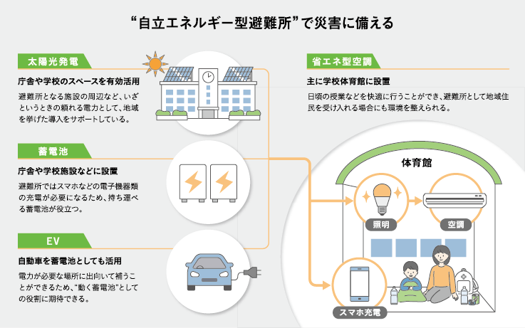 そこで同社が提案するのが、太陽光発電や蓄電池などの活用でエネルギーを自給自足する“自立エネルギー型避難所”の整備だ。内容は、学校の校舎や周辺の建物に太陽光パネルを設置して、災害時に体育館へ電力を供給できるようにするというもの。蓄電池を施設に備え付けたり、EV(電気自動車)を移動式蓄電池として活用したりすることで、さらに電力が必要な場合の助けになるという。同社はコンサルティングを通し、節電効果の高いLED照明や空調への転換、太陽光発電設備や蓄電池の導入、公用車のEV化など脱炭素事業を手がけてきた。得意とする環境分野を応用し、災害対策を強化する取り組みを伴走支援している。