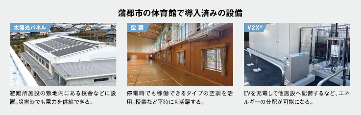同市では令和4年度に公共施設の照明LED化を完了させた。その後、幅広い脱炭素施策を民間提案制度で募り、防災力強化を盛り込んだ同社のプランを採用した。「再生可能エネルギーを導入したいと考え、当初は太陽光パネルの設置が目的でした。同社の提案に含まれていた、避難所となる体育館への空調や蓄電池の導入は、当市が目指す“安全安心なまちづくり”にもつながります。もともとやりたかったものの、進め方が分からなかった連携の方向性が見えたことが決め手になりました」と、西浦さん。対象施設が多いため、優先順位が高い“避難所・BCP施設”から着手。太陽光パネルのほか、蓄電池とEVで電力のバックアップ体制を整え、空調には停電時も稼働するものを採用して、エネルギーの自立を図っている。令和6年度は、指定避難所である中学校6校と蒲郡文化広場の体育館で導入が完了しているという。