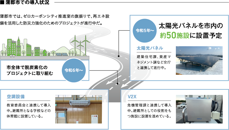 “ゼロカーボンシティ”を宣言し、脱炭素の取り組みを進める蒲郡市。令和6年度からは災害対策との両軸で、空調設備や蓄電池などを整備中だ。部門を越えて連携することで、庁内の意識に変化を感じているという。