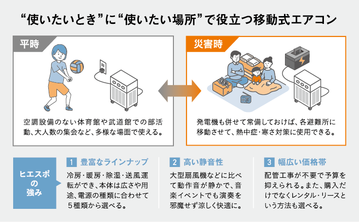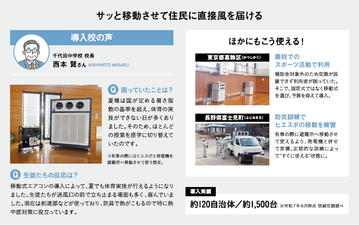 同町ではその後、町内にある小・中学校の体育館に固定式の空調を導入した。現在ヒエスポは中学校の武道館に配置され、部活動の場で活躍しつつ、いざというときの備えとなっている。「教育委員会としては、あくまでも“子どもファースト”です。移動式エアコンの導入で熱中症のリスクを抑えることができ、カリキュラムの幅が広がったのが何よりうれしいですね」と森田さん。