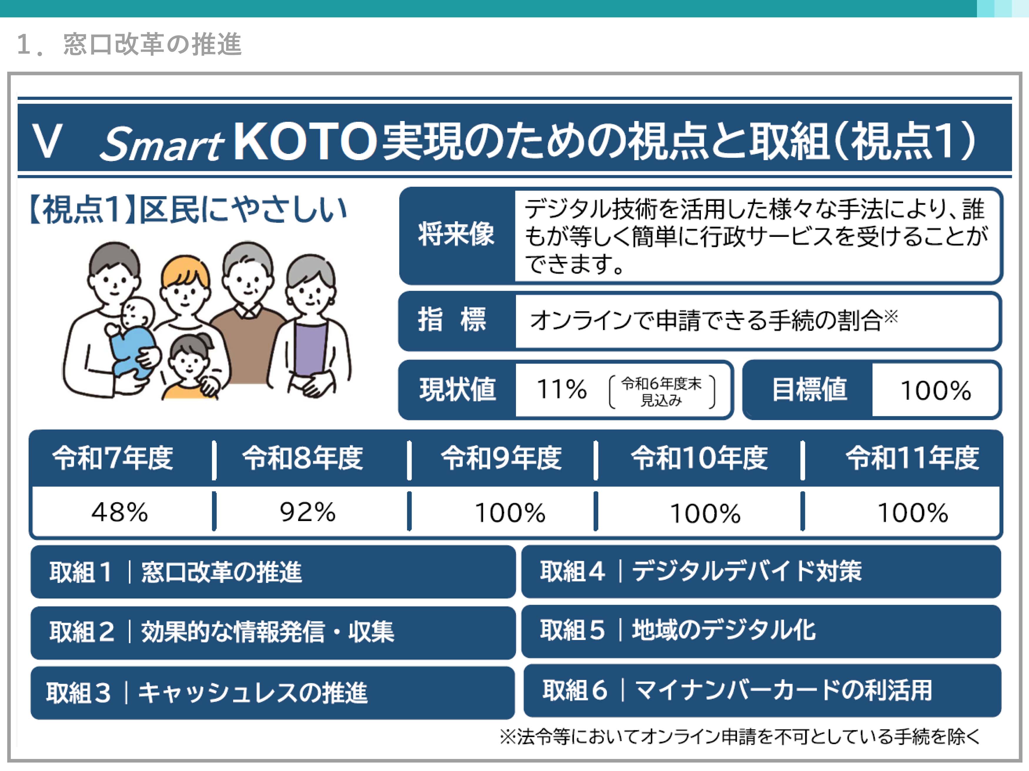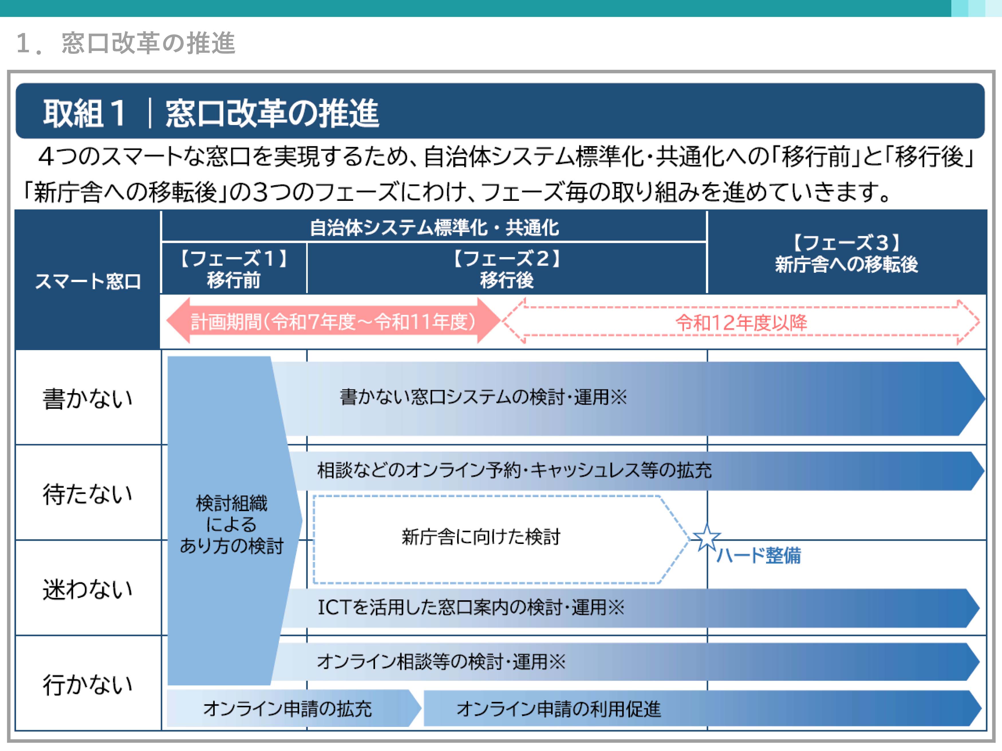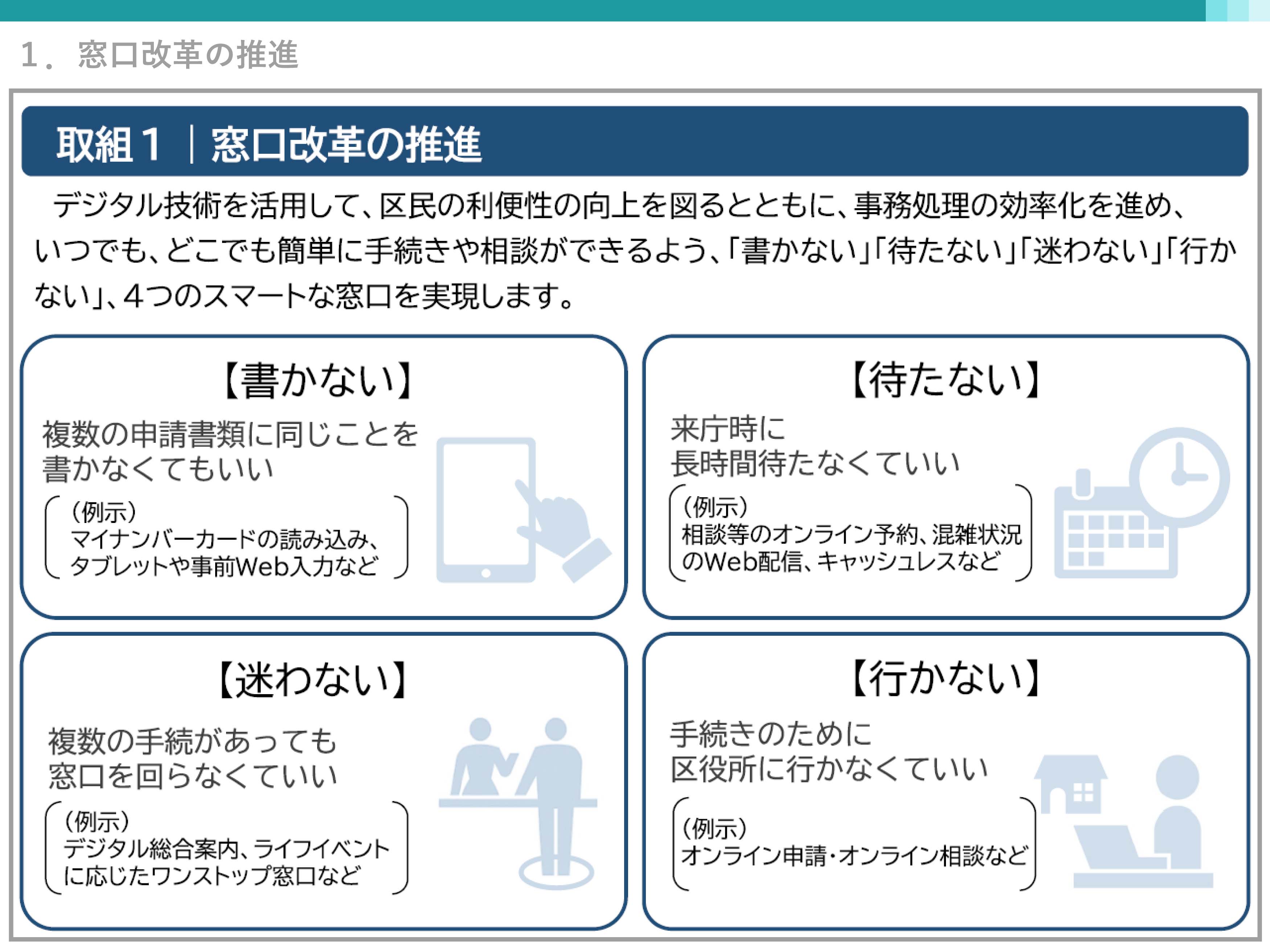 まず、窓口改革の推進の部分です。こちらについては、デジタル技術を活用し、誰もが等しく簡単に行政サービスを受けることができることを目指して、様々な取り組みを計画しました。