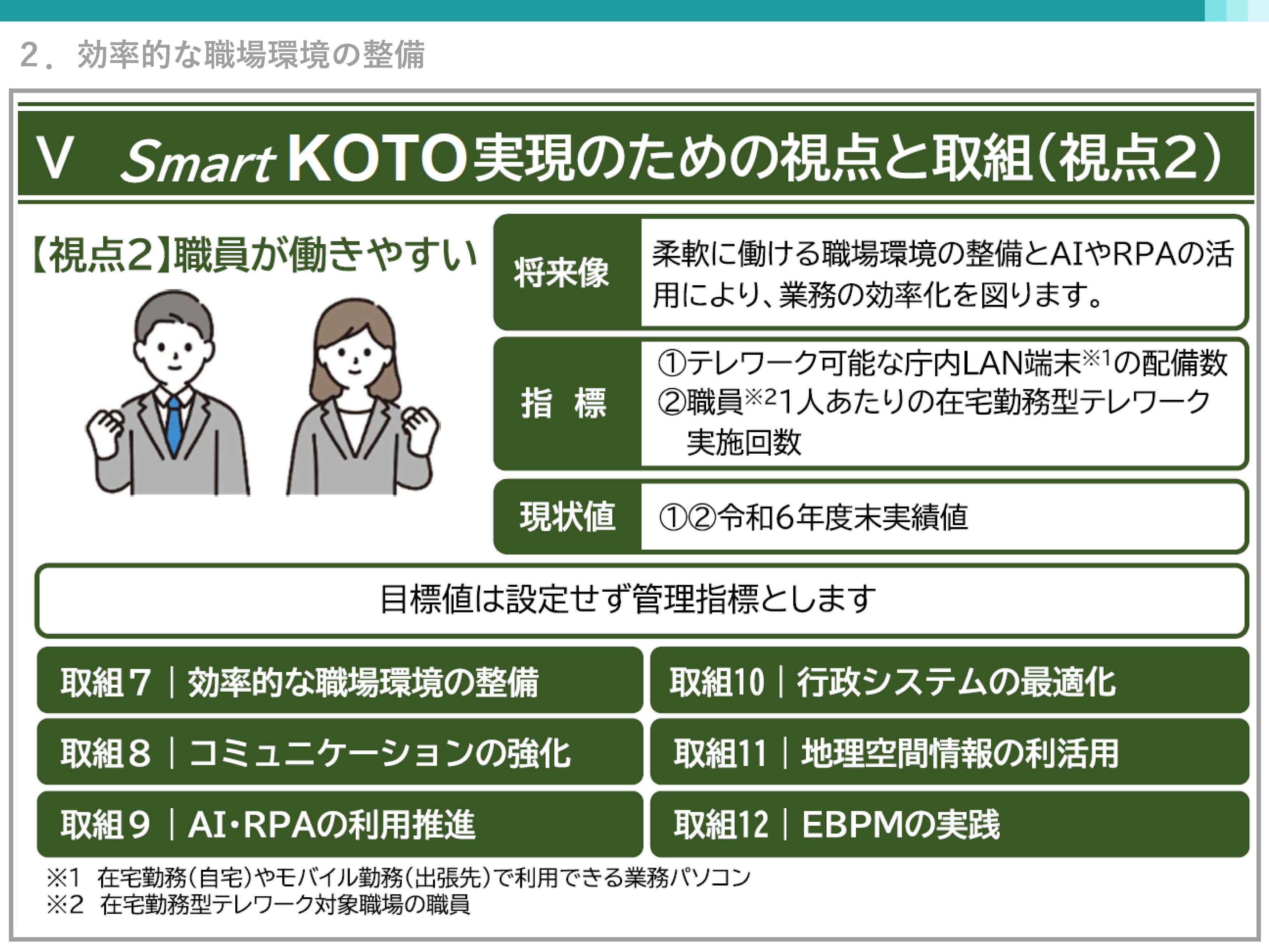 視点としては、“職員が働きやすい環境を作っていこう”というものです。柔軟で多様な働き方を受け入れる環境を目指すので、AIやRPA等デジタルツールも活用し、業務の効率化を進めています。特に注力しているのが、テレワーク可能な庁内LAN端末を整備するという点です。